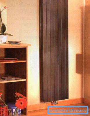 Meidän on myös korostettava pystysuorat patterit. Jos lämmittimen sijoittaminen ikkunan alle ei ole kovin kätevää, huoneen suunnittelun ohjeet mahdollistavat pystysuoran jäähdyttimen sijoittamisen kulmaan. Leveys on melko pieni (kirjaimellisesti 5-7 osaa), mutta korkeus voi olla 2 metriä.